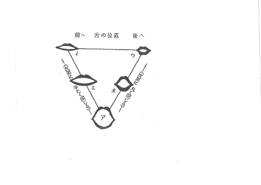 以下の口形図を参考に、それぞれの母音を、ア・エ・イ・オ・ウ・ンの順に、主音(ミ)の高さで20秒程度引きましょう。
